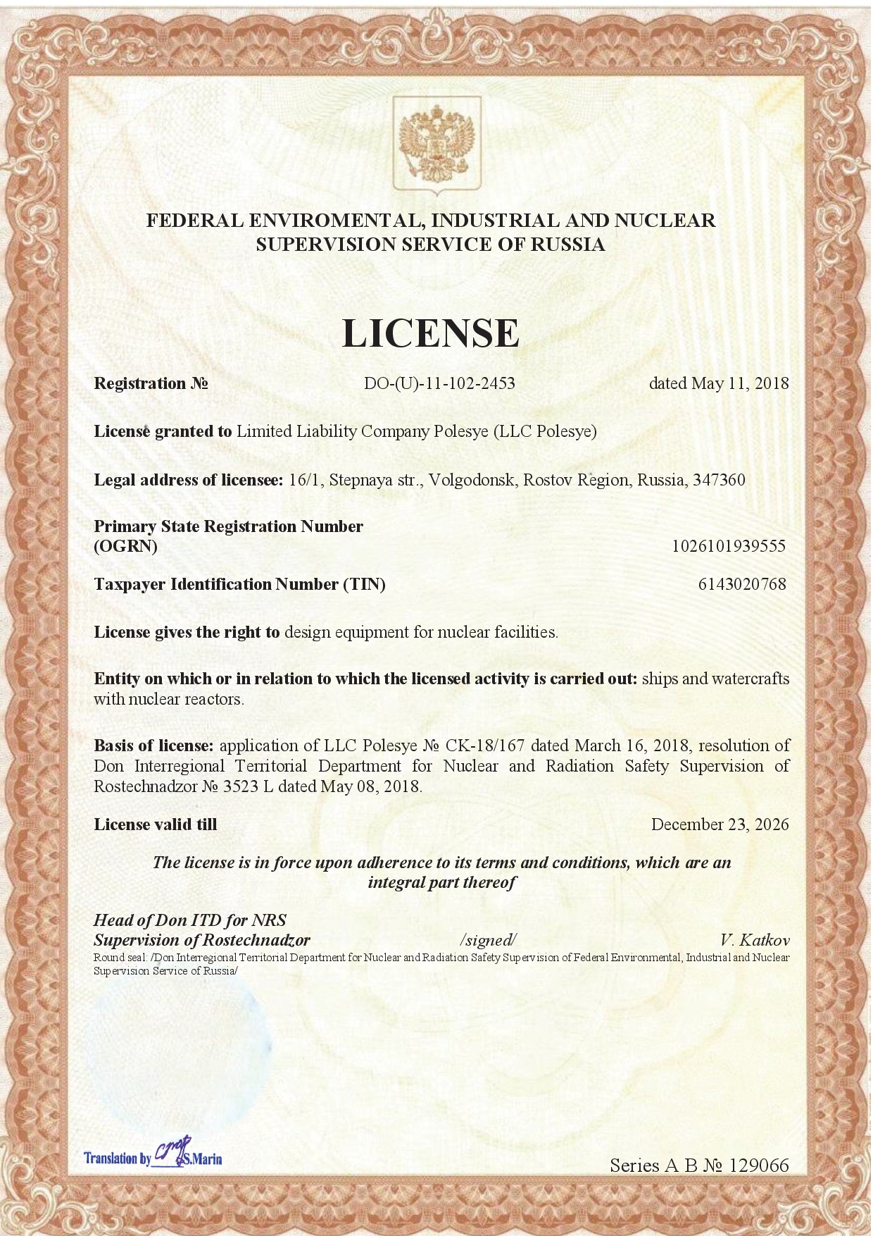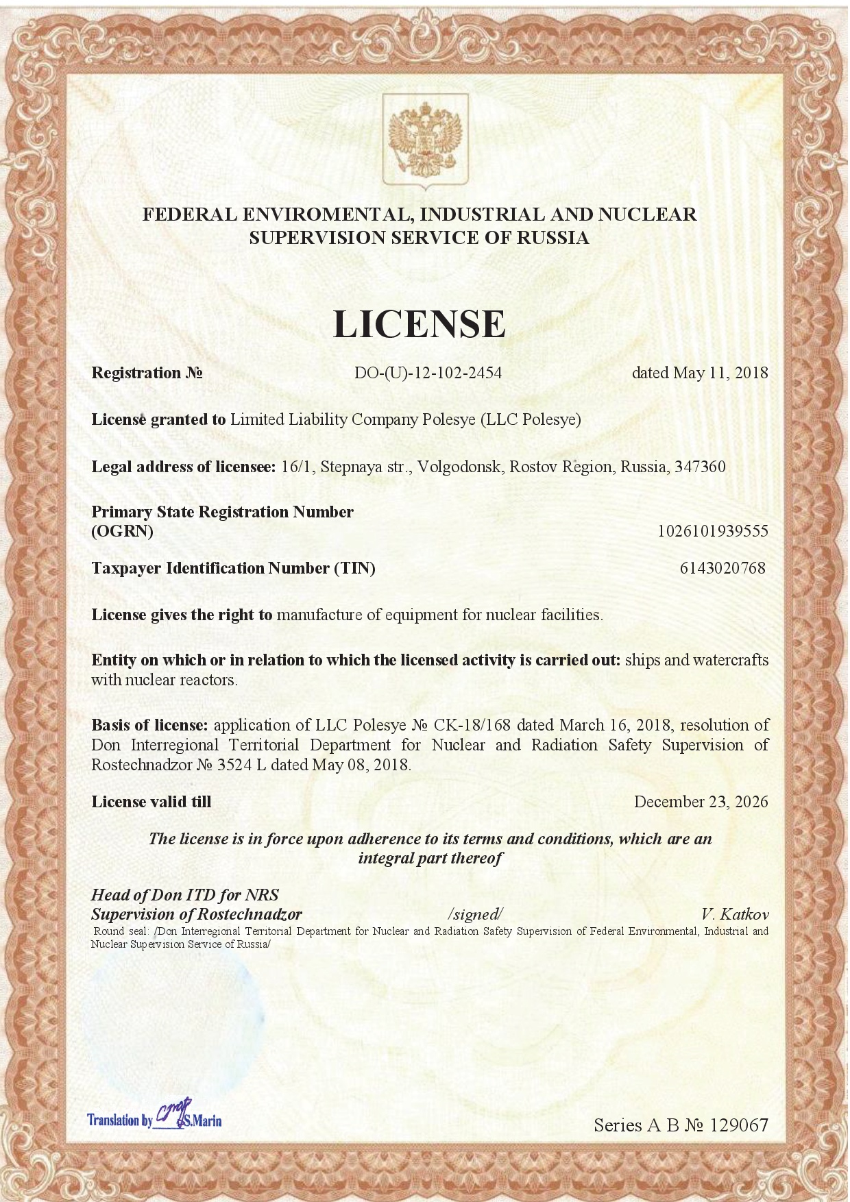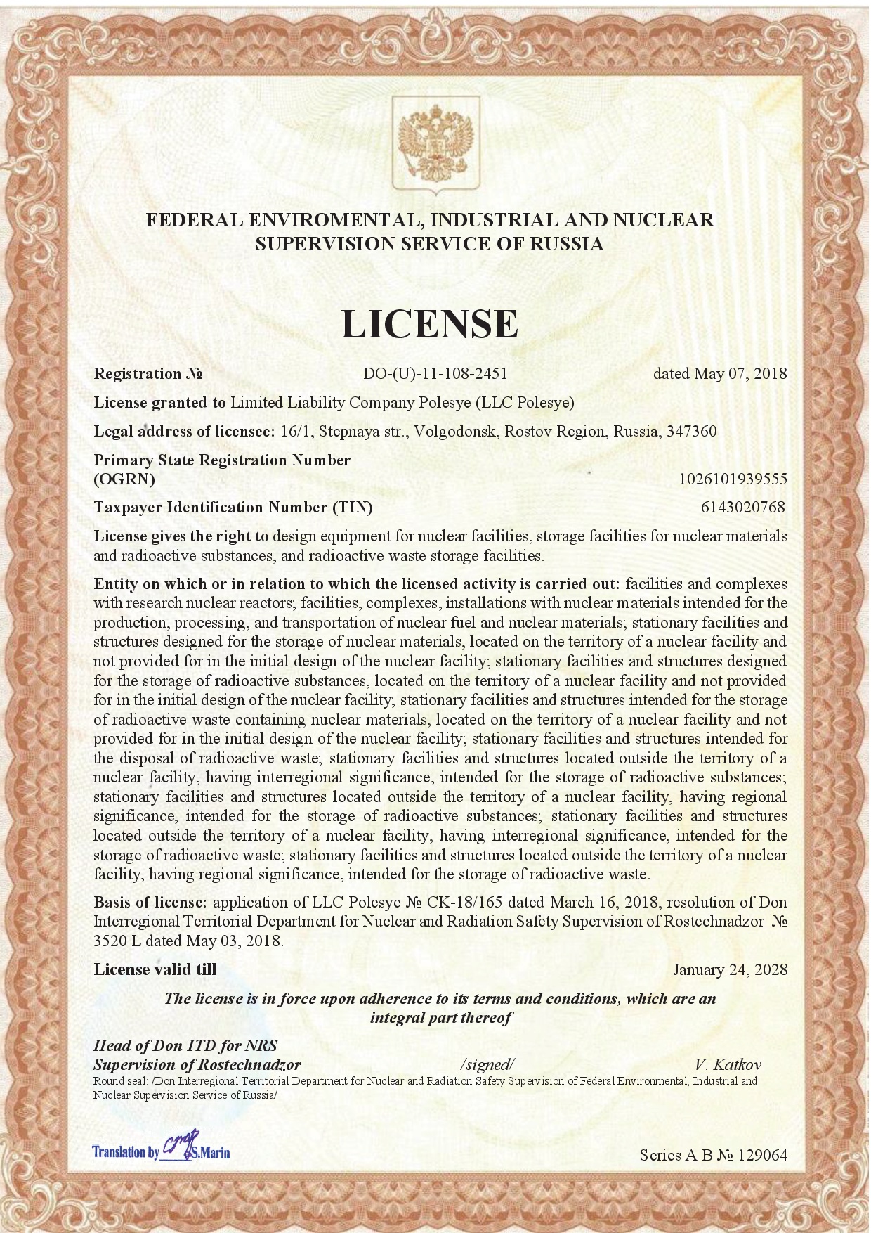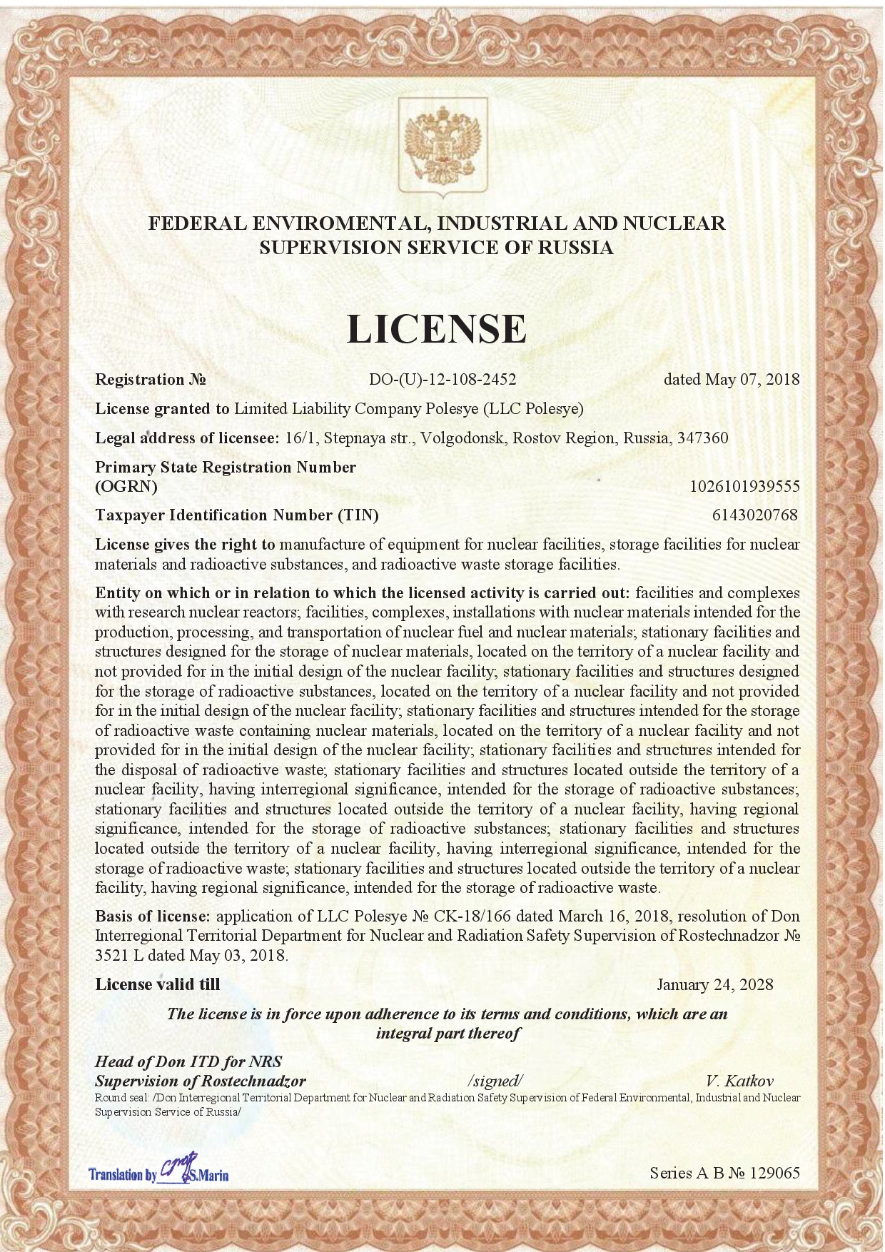 No. DO- (U) -12-108-2452 dated May 07, 2018. License gives the right to manufacture of equipment for nuclear facilities, storage facilities for nuclear materials and radioactive substances, and radioactive waste storage facilities. License valid till January 24, 2028.