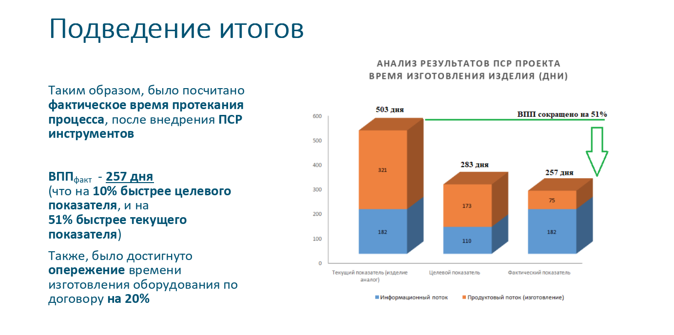 Одним из наиболее значимых результатов стало сокращение времени изготовления изделий более чем на 50%. Полученные в ходе реализации этого ПСР проекта опыт, наработки и лучшие практики будут активно применяться при изготовлении последующих партий продукции, а также при запуске новых ПСР проектов, обеспечивая дальнейшее совершенствование наших производственных процессов.