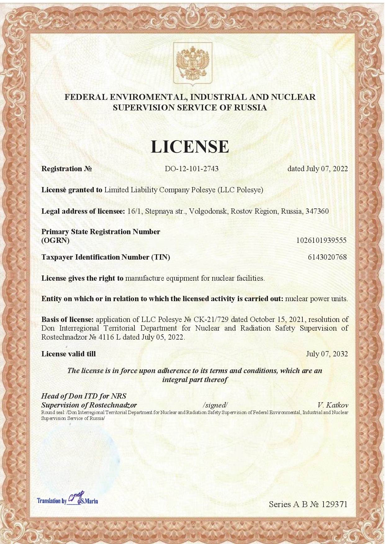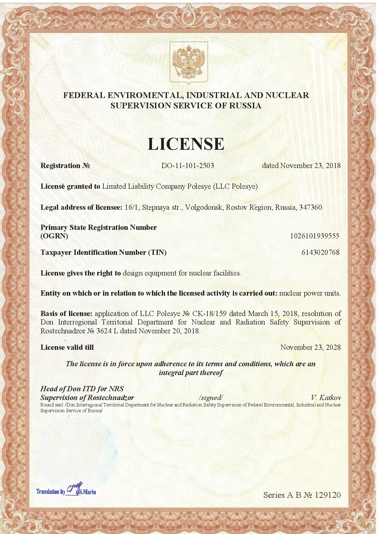 No. DO- (U) -12-108-2452 dated May 07, 2018. License gives the right to manufacture of equipment for nuclear facilities, storage facilities for nuclear materials and radioactive substances, and radioactive waste storage facilities. License valid till January 24, 2028.