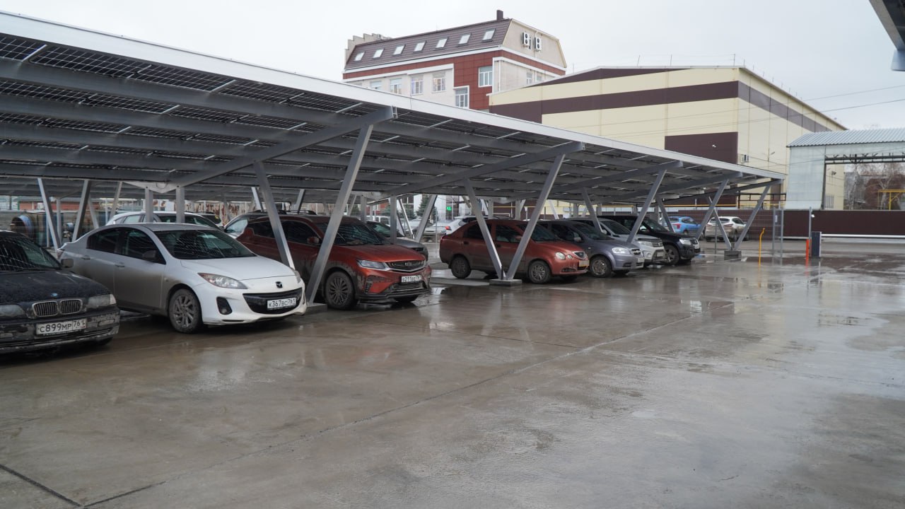 Установка представляет собой навесы над автомобилями, на крыше которых находятся солнечные панели.